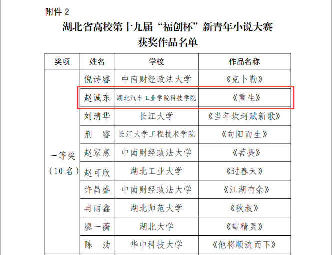 本网讯(文/吴文斌)近日,团省委公布了湖北省高校第十九届“福创杯”新青年小说大赛结果,科院机械与材料工程系K机制195班学子赵诚东的小说《重生》从众多参赛作品中脱颖而出,获得一等奖,指导教师苗源获得“优秀指导教师”称号。本次大赛由省作协、省学联、湖北大学联合举办,大赛共征得省内外稿件近500篇,一等奖、二等奖、三等奖设置名额分别为10、15、20。